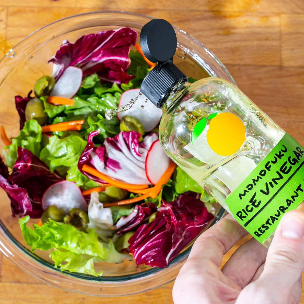 Meet Momofuku Rice Vinegar. Our organic vinegar is the perfect way to add a zesty dash of acid to salad dressings, soups, fresh seafood, and marinades.